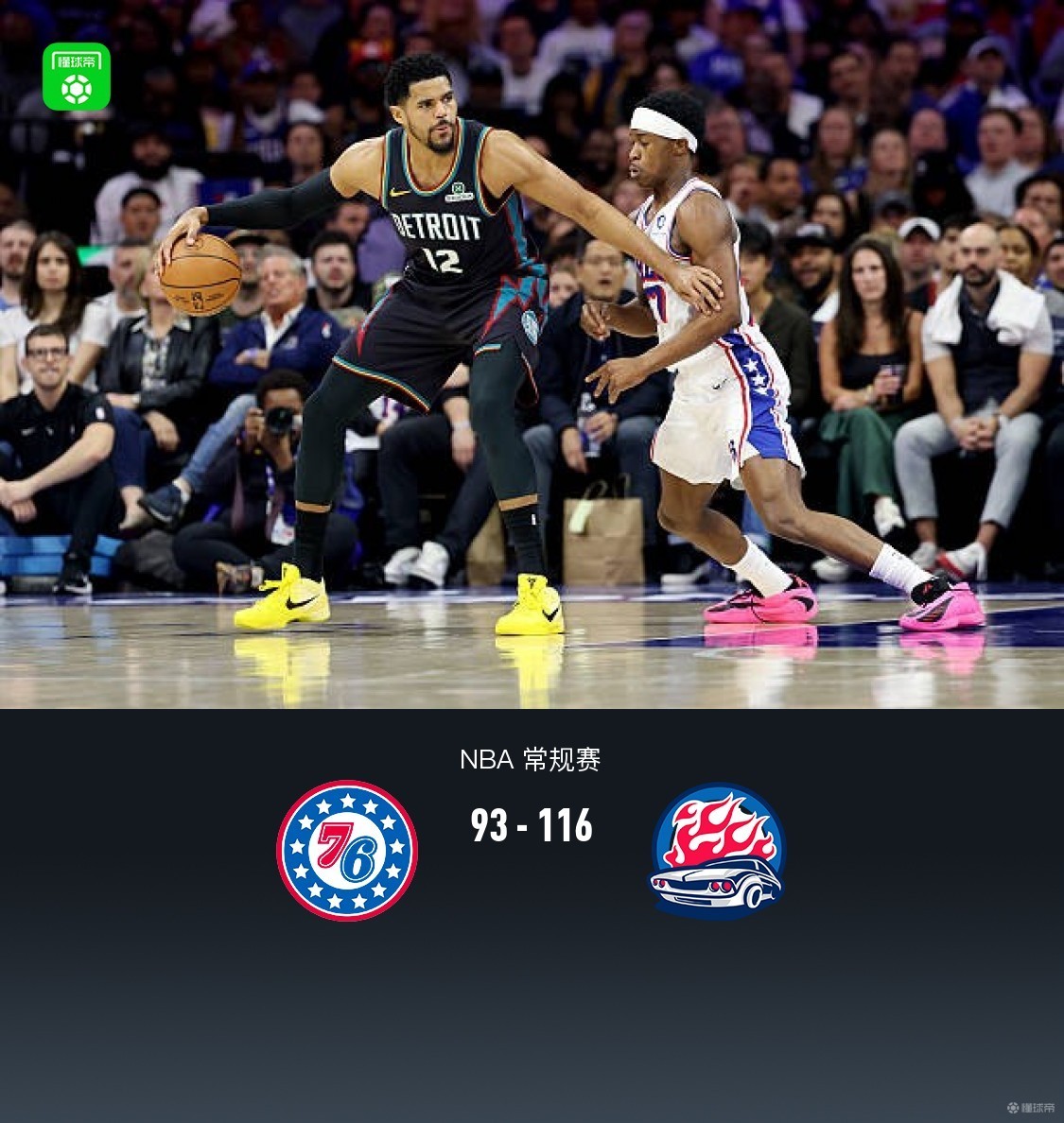 第四节76人巴洛拿下6分,活塞托拜厄斯-哈里斯拿下4分,最终76人93-116不敌活塞