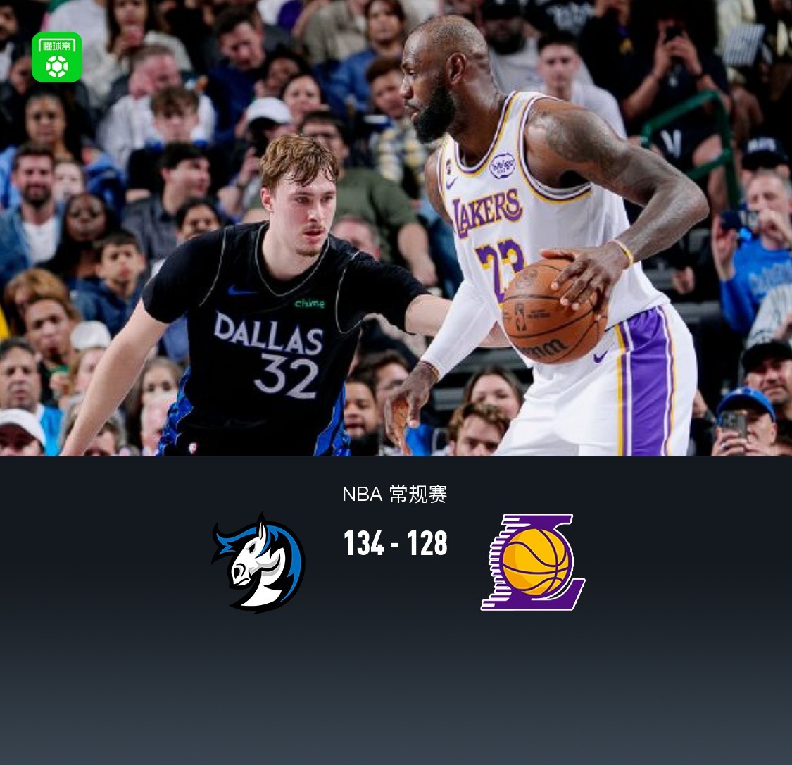 北京时间4月6日NBA 常规赛,达拉斯独行侠对阵洛杉矶湖人。湖人东契奇、里夫斯常规赛报销,詹姆斯单独带队。上半场独行侠一度领先22分,湖人反扑追至个位数,半场弗拉格轰下26分,詹姆斯11中9轰下22分,半场独行侠67-61湖人,下半场湖人一度迫近至2分,但独行侠迅速拉开分差,随后独行侠多数时间始终保持10分上下领先,最终独行侠134-128湖人。