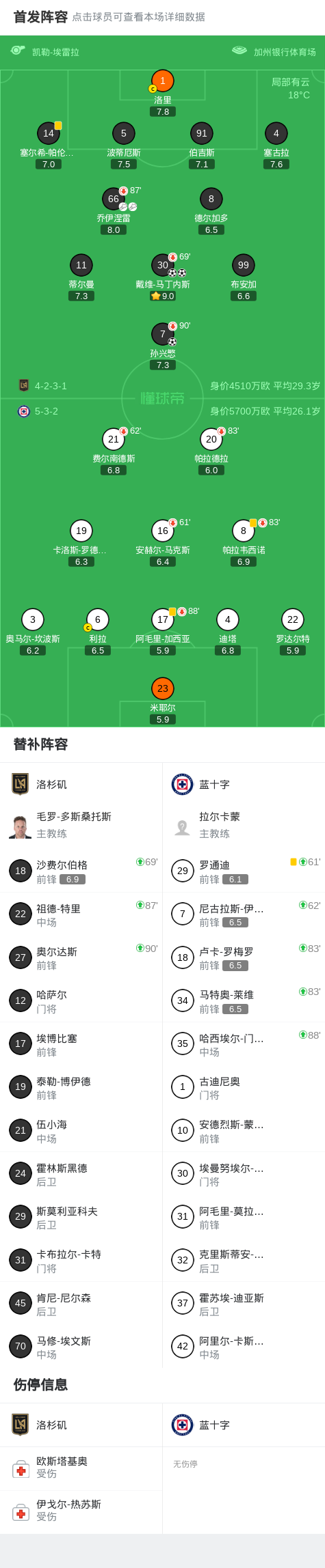 北京时间4月8日中北美冠军联赛 1/4决赛首回合,洛杉矶对阵蓝十字。洛杉矶孙兴慜破门,戴维-马丁内斯梅开二度。最终比分洛杉矶 3-0 蓝十字。点击查看本场比赛详细数据>>点击查看美冠杯完整积分榜>>精彩瞬间第30分钟,洛杉矶球员乔伊涅雷助攻孙兴慜打入一球。第39分钟,洛杉矶球员乔伊涅雷助攻戴维-马丁内斯打入一球。第58分钟,洛杉矶球员戴维-马丁内斯打入一球。 球队阵容 技术统计 标签: 欧冠直播 英超直播 意甲 德甲 西甲