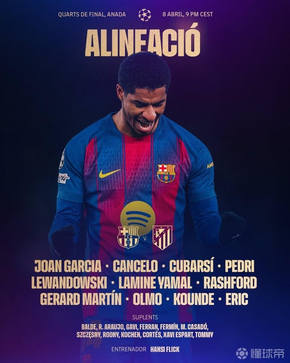 巴萨首发:13-霍安-加西亚、5-库巴西、18-马丁、24-加西亚、23-孔德、2-坎塞洛、8-佩德里、20-奥尔莫、10-亚马尔、14-拉什福德、9-莱万