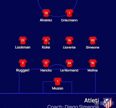马竞首发:1-穆索、3-鲁杰里、16-莫利纳、17-汉茨科、24-勒诺尔芒、14-略伦特、6-科克、20-朱利亚诺、19-阿尔瓦雷斯、22-卢克曼、7-格列兹曼