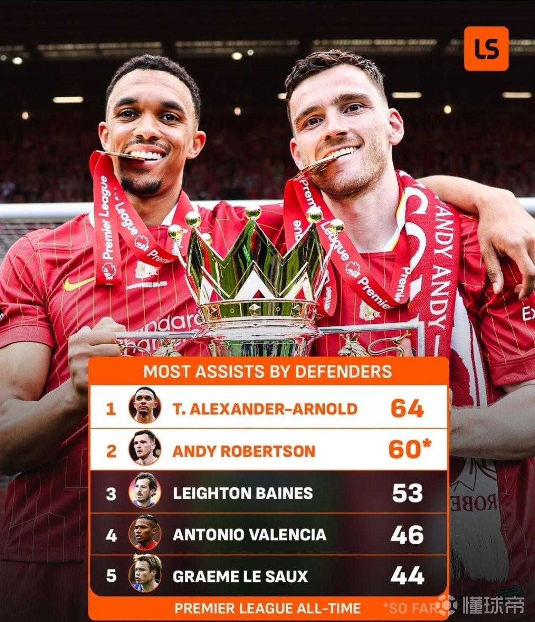在利物浦官方宣布罗伯逊将在赛季结束后离队后,海外媒体统计了英超历史后卫助攻,其中利物浦后卫阿诺德64次第一,罗伯逊60次第二。英超后卫助攻榜阿诺德(利物浦):64次罗伯逊(赫尔城、利物浦):60次贝恩斯(维冈竞技、埃弗顿):53次安东尼奥-瓦伦西亚(维冈竞技、曼联):46次勒索克斯(切尔西、布莱克本流浪者、南安普顿):44次 标签: 欧冠直播 英超直播 意甲 德甲 西甲